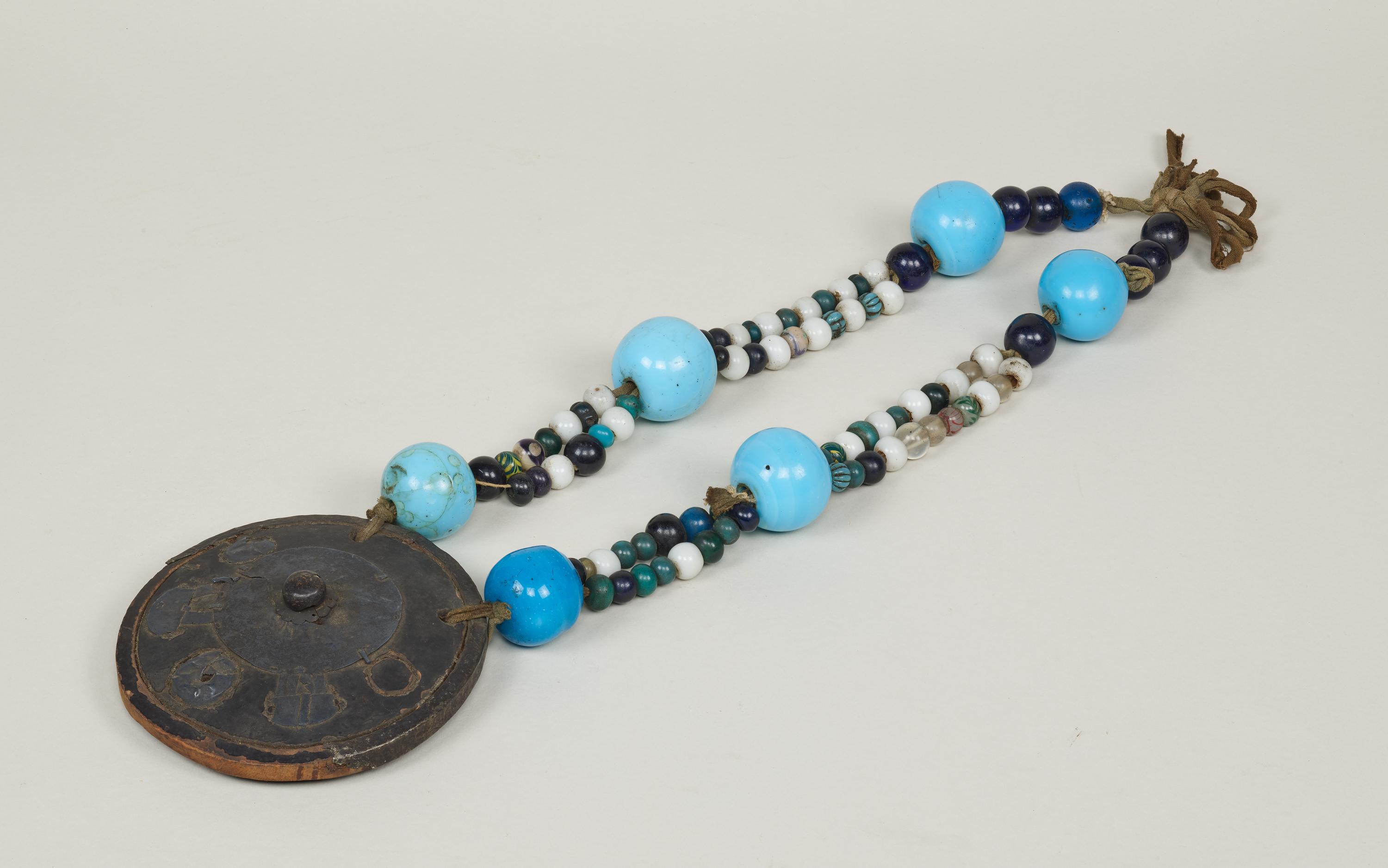 儀礼の際につけた首飾りです。シトキと呼ばれる金属製の飾り板がついています。タマサイはガラス玉を並べた首飾りのことです。