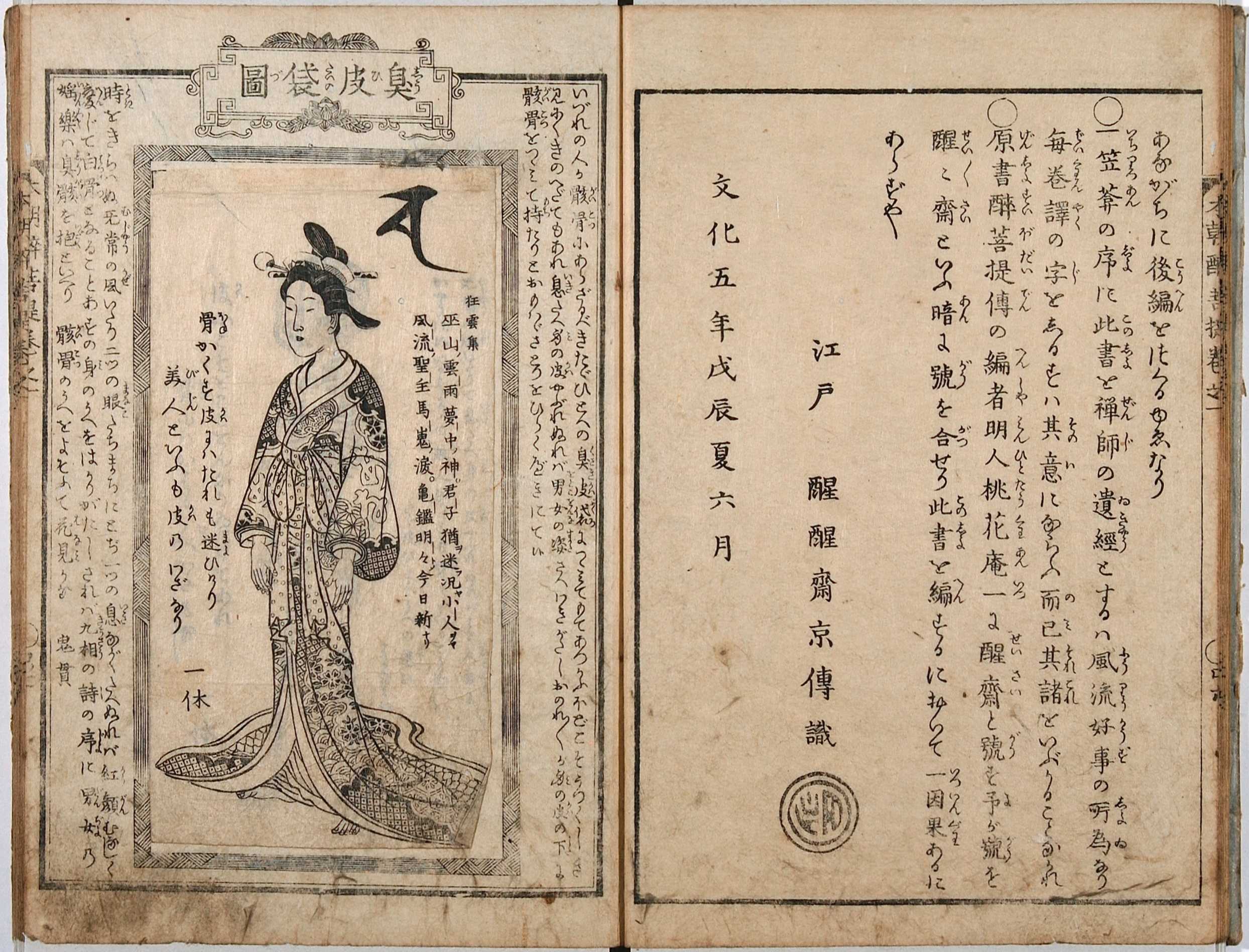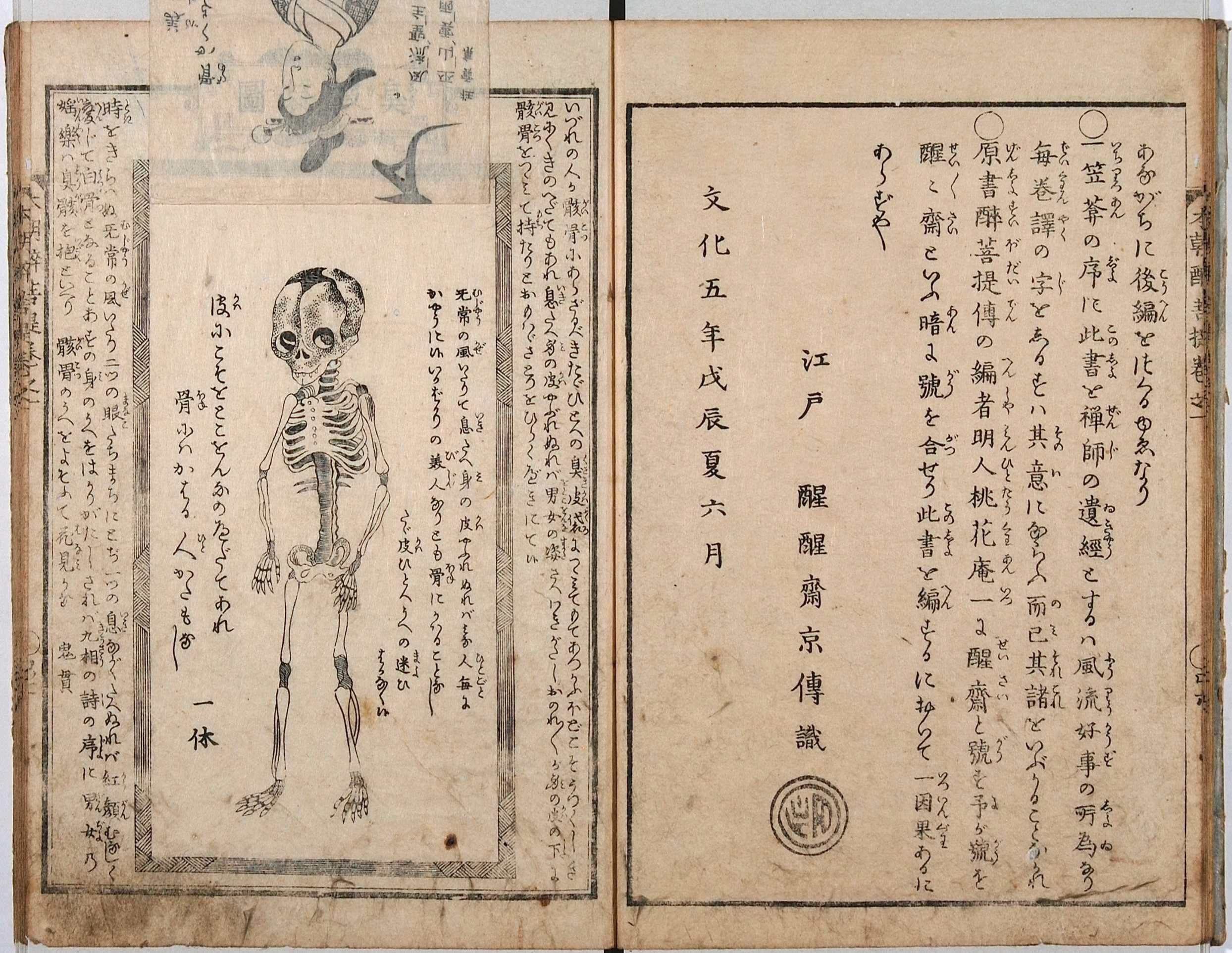 「仕掛本」は、江戸時代の小説本などに見られる特殊な造本で、挿絵の上にもう一枚の挿絵をかぶせ、上の挿絵をめくると下から別の絵が現れるなどの工夫をこらしたもの。文化6年(1809)刊の山東京伝作・歌川豊国画の読本『本朝酔菩提』は、そのさきがけとなる作品で、第一巻の冒頭口絵に「臭皮袋図」という名の美人画が配され、これをめくると下から骸骨の図が出現する趣向で、ひとたび死んでしまえば、誰も同じ骸骨となる、という教訓を表現している。