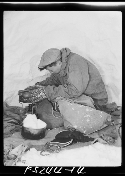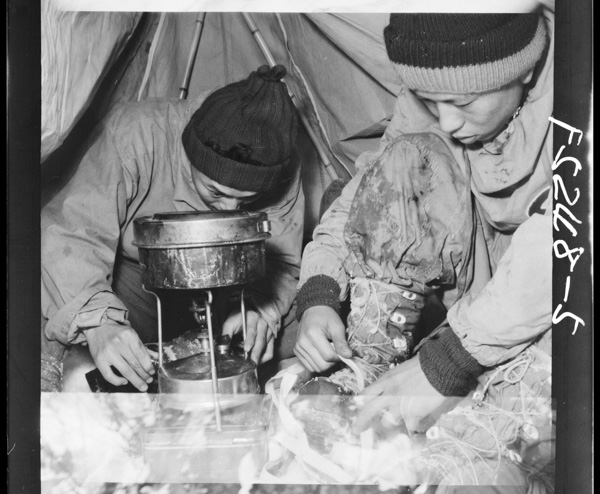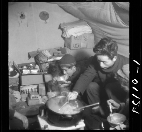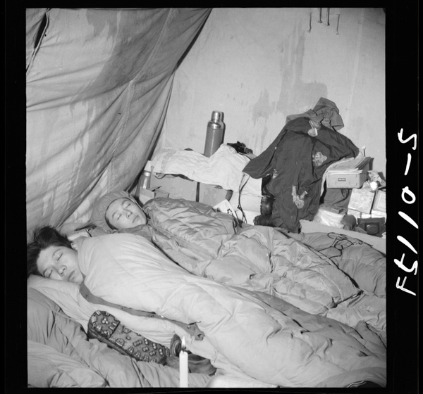 「幕営 たのしい食事をすませたあと 1は外を吹き荒れる嵐もものかは深いねむりにつくのである 2.」『岩波写真文庫 166 冬の登山』p.46-47 より