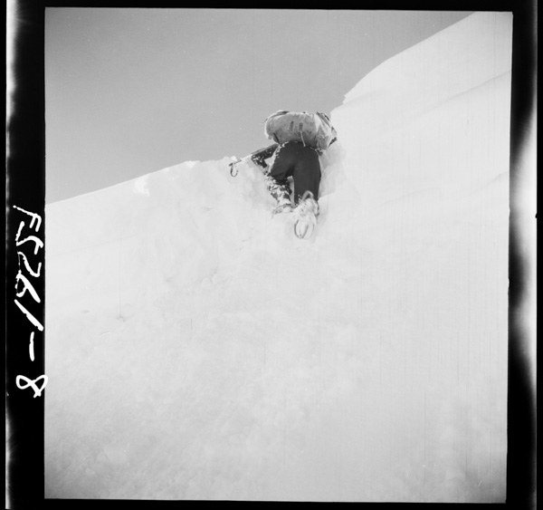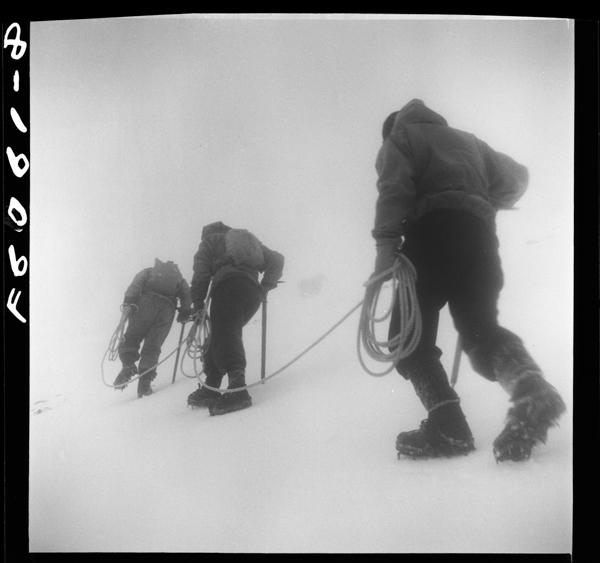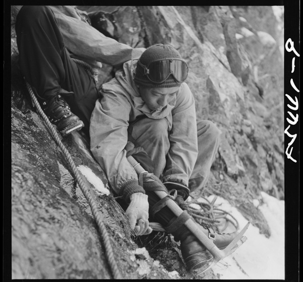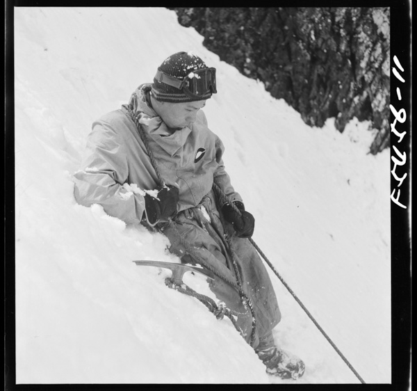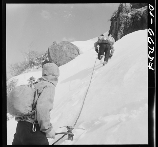 「ザイルの用い方 確保も見せかけや申し訳だけではなく,相手が滑落しても確実に止め得るがっちりしたものでなければならない」『岩波写真文庫 166 冬の登山』p.43 より