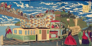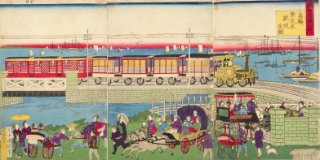このエリアでは、品川宿のすぐそばまで海であり、そこでは潮干狩りや海苔の養殖が行われていたことが分かります。また、高輪には東海道沿いに江戸を守るための関所である大木戸があり、高輪周辺では築堤の上を汽車が走る様子が見られます。