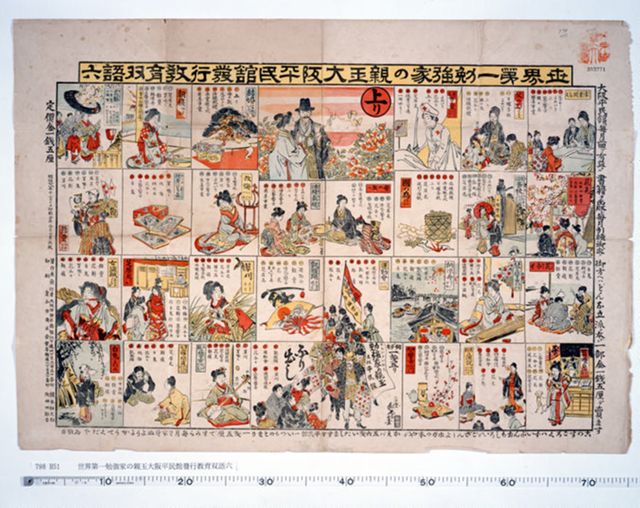 振り出しには本と双六を売る姿が描かれ、双六のマス全体を囲むように大阪平民館(書店)の宣伝文がある。基本は女性の出世双六だが「男女同権」、「慈善事業」など明治の世相を反映したマスもある。 [榎本松之助作 耕雪画 榎本松之助版 71×54cm]