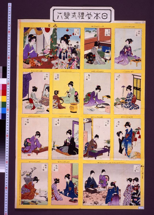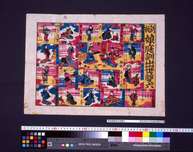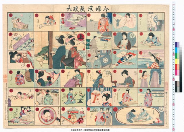 下段中央の「衣服をあらたむるてい」を振り出しに、上段中央の「婚礼の式に望むてい」を上りとする双六。嫁入り前の上流階級の女子が身につけるべき教養や作法が12のマスに美しく描かれている。 [牧金之助版 明治31(1898)年 74×73cm]