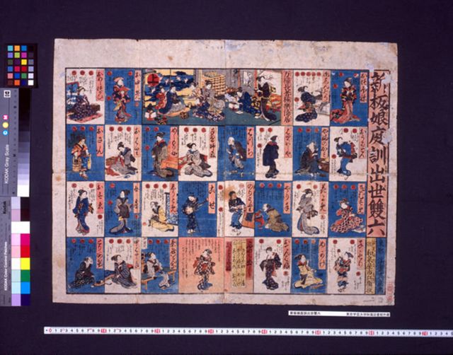 「おどり子娘」を振り出しとし、「万福(まんふく)長者(ちやうじや)極(ごく)楽(らく)隠居(ゐんきよ)」を上りとする双六。各マスには、「手習師匠」や「しうとめ」など、女性の様々な仕事や立場が示されている。 [溪齋英泉画 和泉屋市兵衛版 49×64cm]