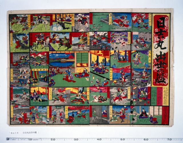 「日吉丸誕生」を振り出しとし、秀吉が天下を取って上りとなる双六。1.と重なるマスが見られるが、人物名は実名となっている。当館所蔵資料は江戸時代のものを明治以降に再版したもの。 [松岡堂松岡利兵衛(金沢)・天摩堂池田伝兵衛(西京) 松栄堂梅村為助(大坂)版 51×73cm ]