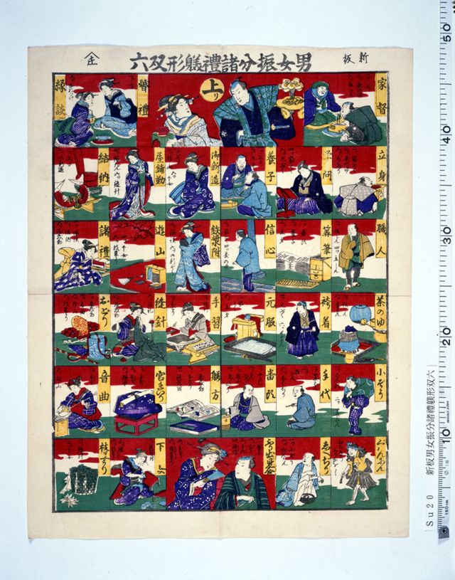 「振り出し見(み)合い」で見合いをし、「結納」「縁談」を経て「婚礼」で上る双六。振り出しと上りの間のマスは左右に分かれており、左半分に女性の、右半分に男性の職名や立場あるいは身につけるべき教養や作法が描かれている。 [山城屋庄次郎版 49×38cm]