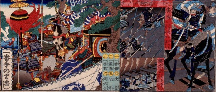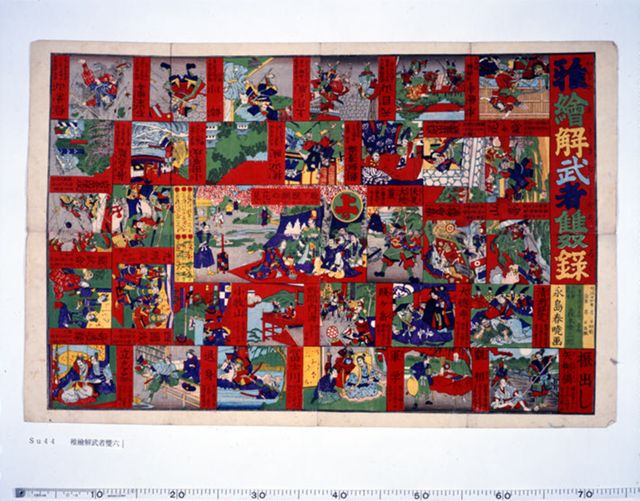 戦場での様々な戦略を集めた双六。「一番手乗り出し」を振り出しとし、「勝(かち)軍(いくさ)諸(しよ)士(し)恩賞(おんしやうを)賜図(たまはるづ)」を上りとする。マスの見出しには模様として家紋が見えるが、特定の武将を示しているわけではない。 [五雲亭貞秀画 安政4(1857)年 70×69cm]