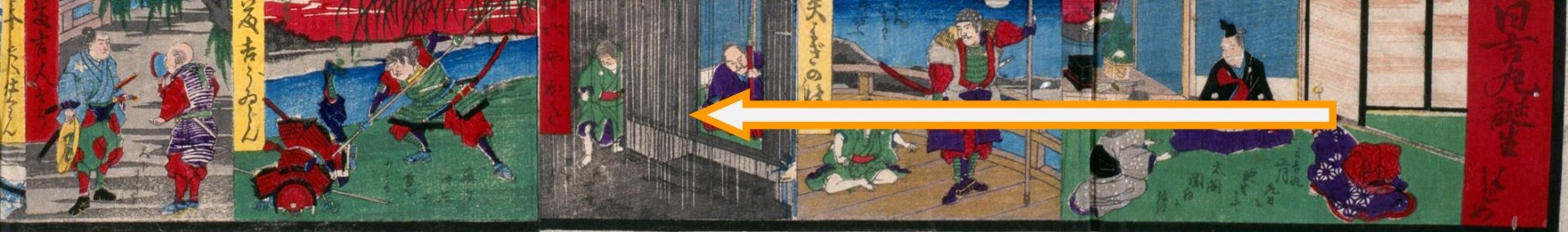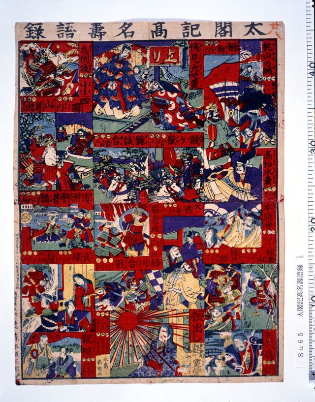 「日吉(ひよし)丸(まる)出産(しゆつさん)の霊(れい)夢(む)」を振り出しとし、「伏(ふし)見(みの)大(おほ)地(ぢ)震(しん)」を上りとする双六。摺(す)りの状態は良いとはいえないが、遊びながら太閤記の名場面を楽しむことができる。 [永島春暁画 森本順三郎版 47×35cm]