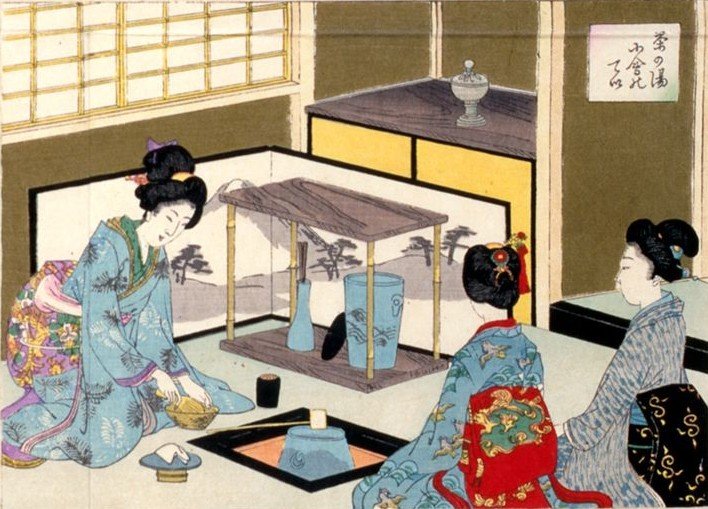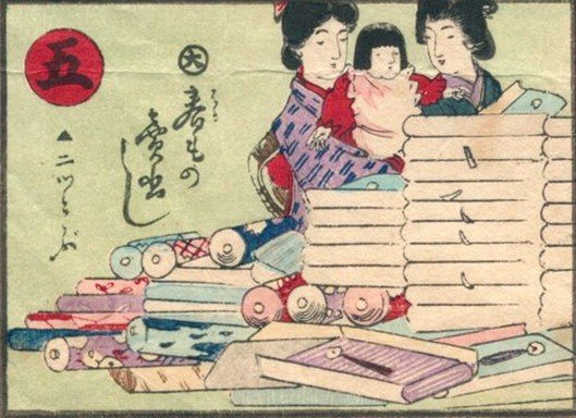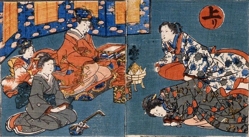 上流家庭の女性を描いたものには、お稽古事の様子や、教養、作法を身につけている淑女の美しい姿を描いたものがあります。また大丸呉服店の広告用の双六では、一人の女性の誕生から嫁入りまでを廻り双六で描き、ところどころに自分の店の売り出し宣伝を入れています。
