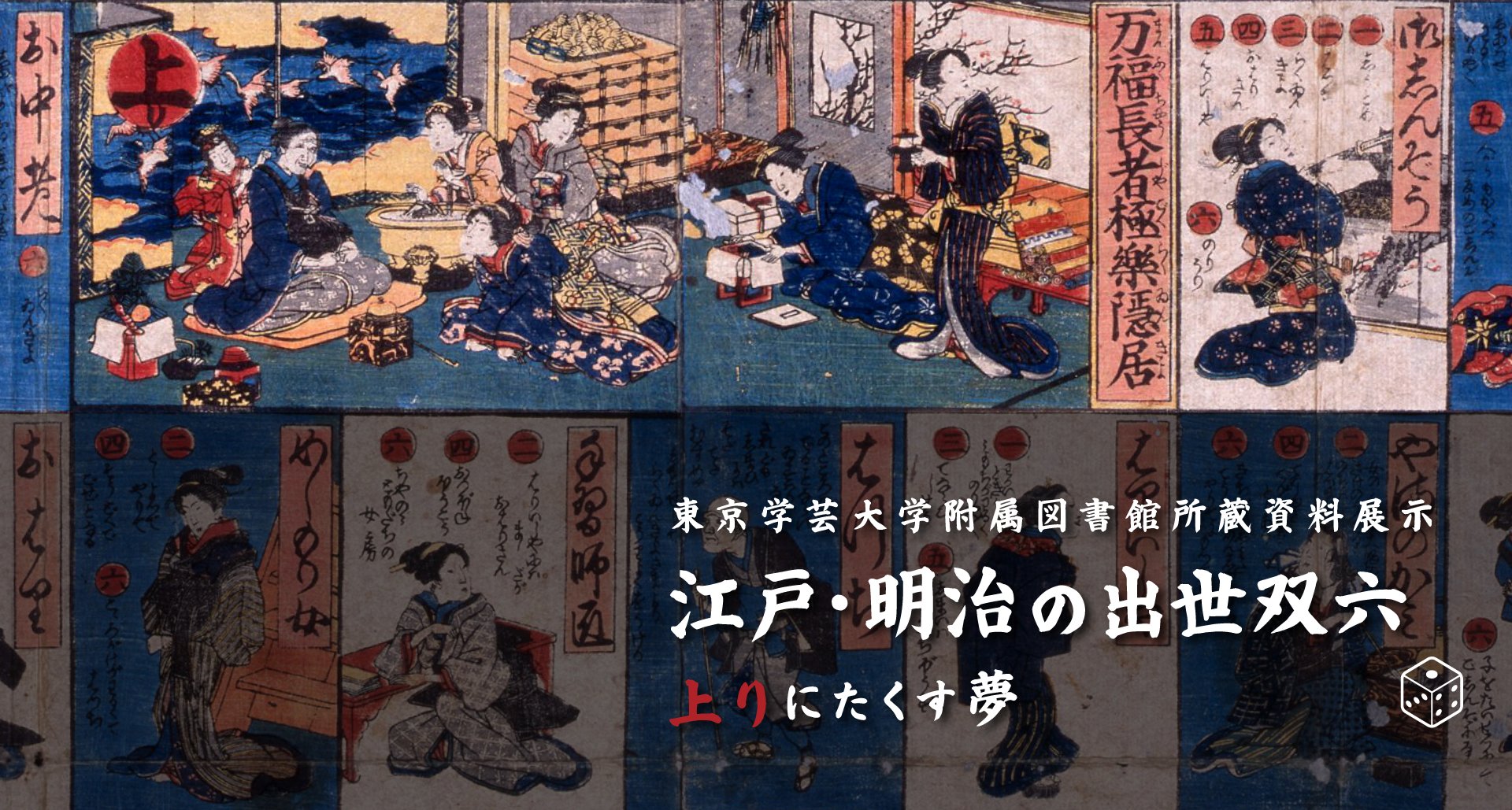 今年は、この双六をできるだけ多くの方々に直接ご覧いただけるよう、双六シリーズの第 2 回目として、江戸明治期を中心とした「出世双六」を総合テーマにとりあげます。いわゆる立身出世のみならず、振り出しから上りまでの間に何らかの向上を願う庶民の夢があり、七転び八起きの仮想人生がもたらすおおらかな楽しみや学びの世界を体験出来るものを選んでみました。また、いくつかのサブテーマを設け、双六と併せて関連資料を展示するほか、画像による紹介や楽しい体験コーナーも用意しました。