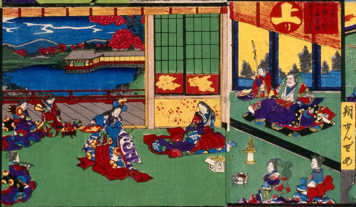 「静(しずか)御前(ごぜん)」を振り出しとする双六。上りのマスには女性に敬われる女主人の様子が描かれる。各マスに配置された多くの賢女に見習って成長することを導く双六と見ることができる。 [一梅齋芳晴画 辻岡屋 51×31cm ]