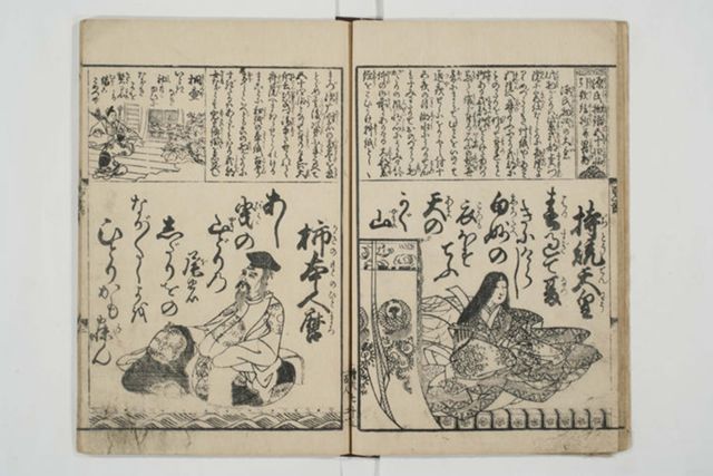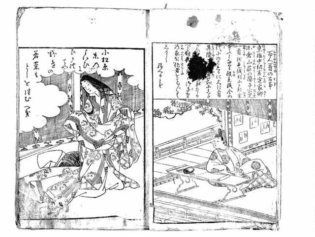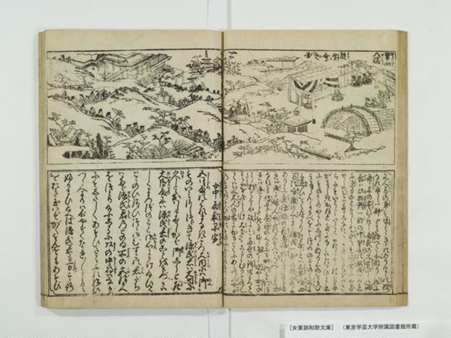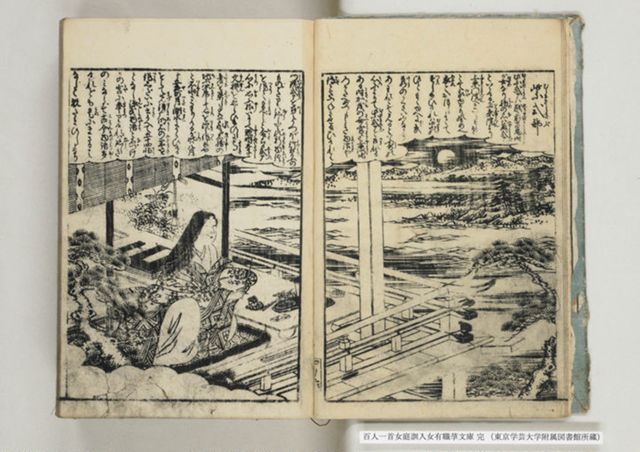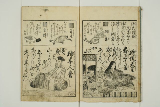 表示部分は女流歌人を取り上げる前付記事の一つで左丁に「紫式部」の項がある。上段には紫式部の名の由来や別称(「日本記の局」)について述べる文章、下段には上東門院に拝謁する紫式部の姿を描いたかと思しき絵が示される。