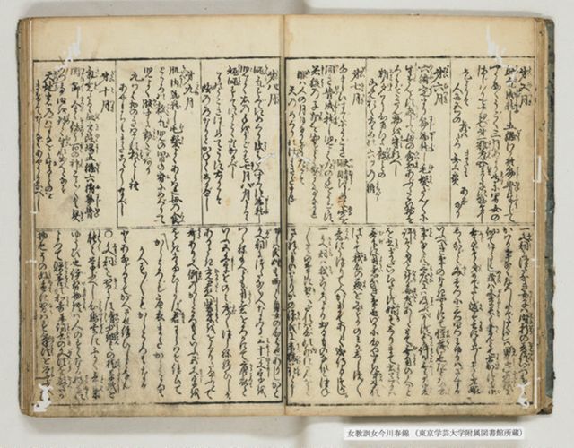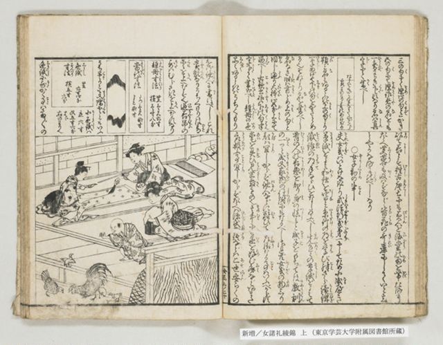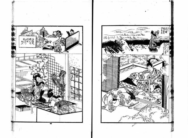 一冊のうちに『源氏物語』への賛否双方の記事を収録する。表示部分は「物語草紙」の項で、各時代の名文を記すものとして『源氏物語』を紹介する。 「読書」の項(9コマ目)では、『源氏物語』は男女の「たはれごと(※「淫乱」と脇書あり)」を記すので、仮にも幼い娘に教えるものではないとする。