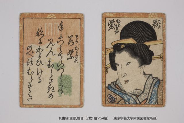 ここでとりあげられる和歌は、藤裏葉巻と若菜下巻以外は各巻の作中歌となっています。小町谷照彦氏は、和歌群は往来物の中で共通し、巻名に関わるものも多く、「何らかの意味において、その巻の頂点となる場面を示して」おり、源氏物語の代表的な場面を網羅し、物語概要を掴むことのできる秀歌撰であると指摘されています*1。また、「源氏香」は代表的な組香の一つで、香の組み合わせを示す図を「源氏香図」といいます。組香は女性の教養の一つとされ、「源氏香図」自体もデザインとして広く用いられていきました*2。往来物では、本来存在しない桐壺、夢浮橋の香図を描き込む例も多数見られます。こうした巻名と和歌、香図の組み合わせは、『其由縁源氏絵合』(刊年不明)といった往来物以外の資料にも見られます。本資料は一種のかるたと見ることができ、絵札の絵柄から『偐紫田舎源氏』(柳亭種彦,文政12[1829]~天保13[1842])に関するものと考えられ、和歌と香図を示す文字札と、絵札の巻名とを照合して遊ぶものと推測されます。往来物により共有された知識の拡がりは、こうした資料の存在からも伺えます。なお、和歌と絵図の組み合わせは、『女用文艶詞』(刊年不明)や『女庭訓往来』(嘉永4[1851])のように、八景や四季といった趣向と結びつけられたものもありました。登場人物をとりあげる例としては、女三宮の姿を描くものも散見されます(『女文章四季詞鑑』 天明9[1789])。
