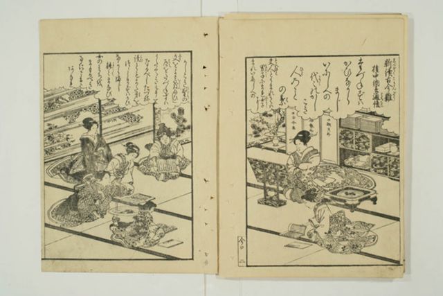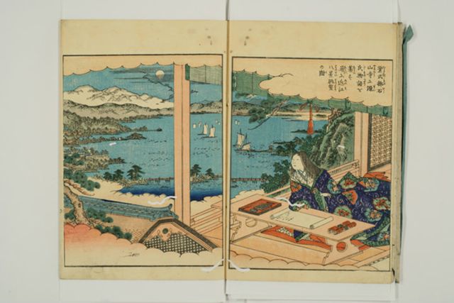 『源氏物語』の作者である紫式部は、物語関連記事としても、単独でもとりあげられます。多くは肖像画を伴い、代表的な構図は石山寺で『源氏物語』を執筆する様子を描いたものです*1。上東門院から執筆を依頼され石山寺に参籠した紫式部が、八月十五夜に琵琶湖の水面に映る月の姿を見て須磨・明石の巻を起筆したという伝説に基づくもので、多くの場合、遠景に月が描き込まれます。『女用文章糸車』(刊年不明)のように、近江八景と共に描かれる例も見られます。『百人一首女庭訓入女有職莩文庫』(文政1[1818])のように文章が添えられる例も多く、紫式部の出自やその名の由来、『源氏物語』執筆の経緯等が記されます。『女訓百人一首錦鑑』(天保15[1844])など、優れた歌人の一人として、詠歌と共に取り上げられる例もあります。