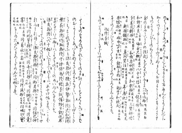 往来物の本来の役割の一つとして、習字手本があります。『源氏物語』については、どのような内容が手本となったのでしょうか。当館コレクションにおいては、『源氏物語』を話題とする手紙文や巻名を扱う例がみられます。『わかみとり』(長谷川妙躰書 宝永4[1707])は手紙文を本文とする女筆手本で、下巻の『うすもみち』に『源氏物語』の講釈についての手紙文が収録されます。『初登山文章 (手習児文章)』(矢沢敬親書 安政7~万延1[1860])は手習師匠の手控書で、学習者に手本として書き与えたと考えられる様々な内容が収められます。二巻に「源氏五拾四帖長歌」があり、『源氏物語』五十四帖の巻名を織り込む長歌で、「源氏文字鎖(げんじもじぐさり)」と呼ばれるものです。これについては、散らし書きによる例も見られます(『女用文姫鑑』江戸後期)。