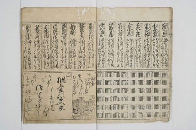 往来物の中の『源氏物語』記事として最も多く見られるのが、巻名・香図・和歌・絵図の組み合わせです。早い例では前出の『女源氏教訓鑑』の本文に見られ、添えられる絵図は場面絵となっています。女性用の往来物としてベストセラーに数えられる『女大学宝箱』(享保1[1716])では前付記事として収録され、広く享受されたと考えられます。付録的記事としては主に二段組、三段組版面の上段に配置される頭書として収録され(『女文選料紙箱』 寛延4[1751])、巻を象徴する絵柄(意匠絵)を添えるものも多数あります(『絵入注釈百人一首』 嘉永1[1848]ほか)。往来物の刊行が進むと共に、デザインや内容に工夫が加えられていきました。
