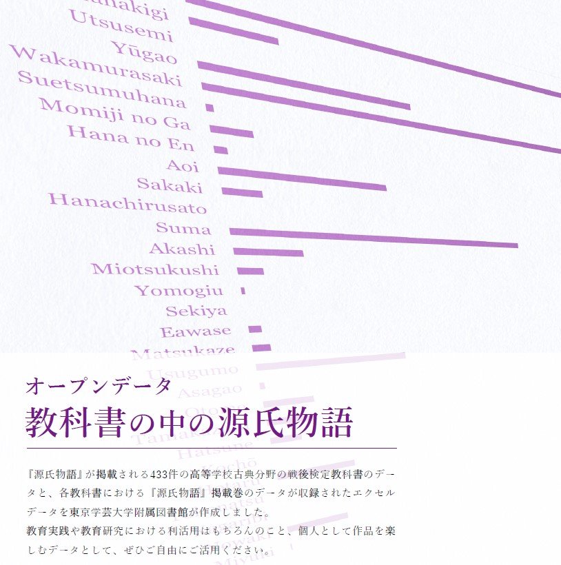 本データは、5月に開催した企画展「出会い、学ぶ『源氏物語』」の準備として行った、高等学校古典分野の戦後検定教科書を対象とする調査で得られた667件のファクトデータを基礎としています。『源氏物語』が掲載される433件の教科書データと、各教科書における『源氏物語』掲載巻のデータが収録されています。