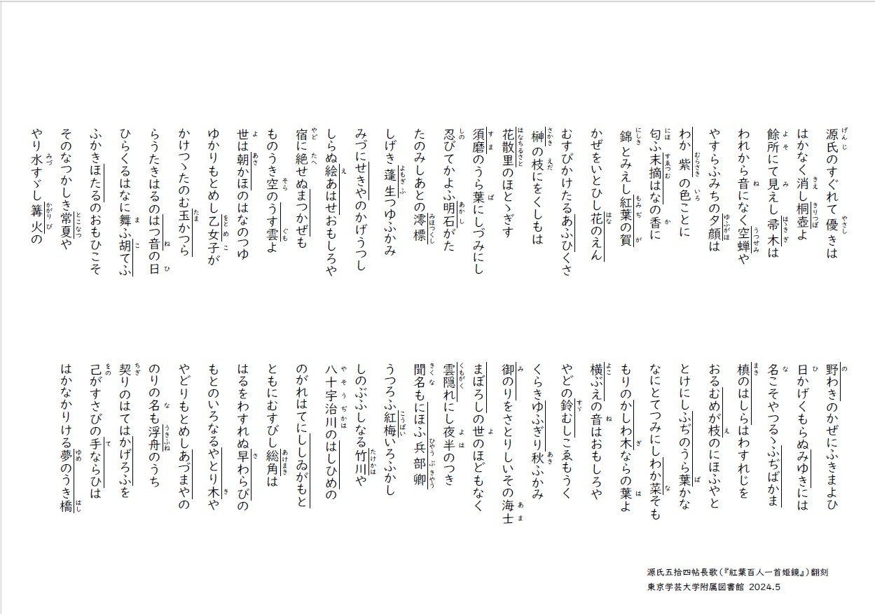 このたび、東京学芸大学附属図書館では、学習教材としての『源氏物語』に着目して、当館所蔵の教育コレクションの企画展示「出会い、学ぶ『源氏物語』」を開催することとなりました。これは、中古文学会のご支援を受けつつ、本学教員と学生、卒業生、そして附属図書館職員の協働活動の成果であります。