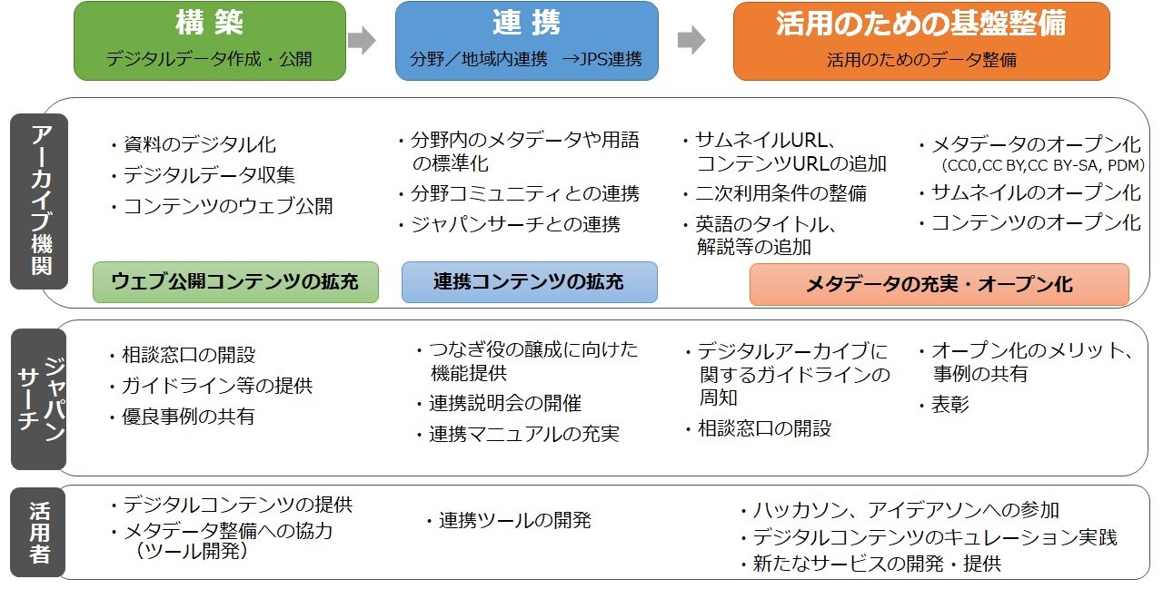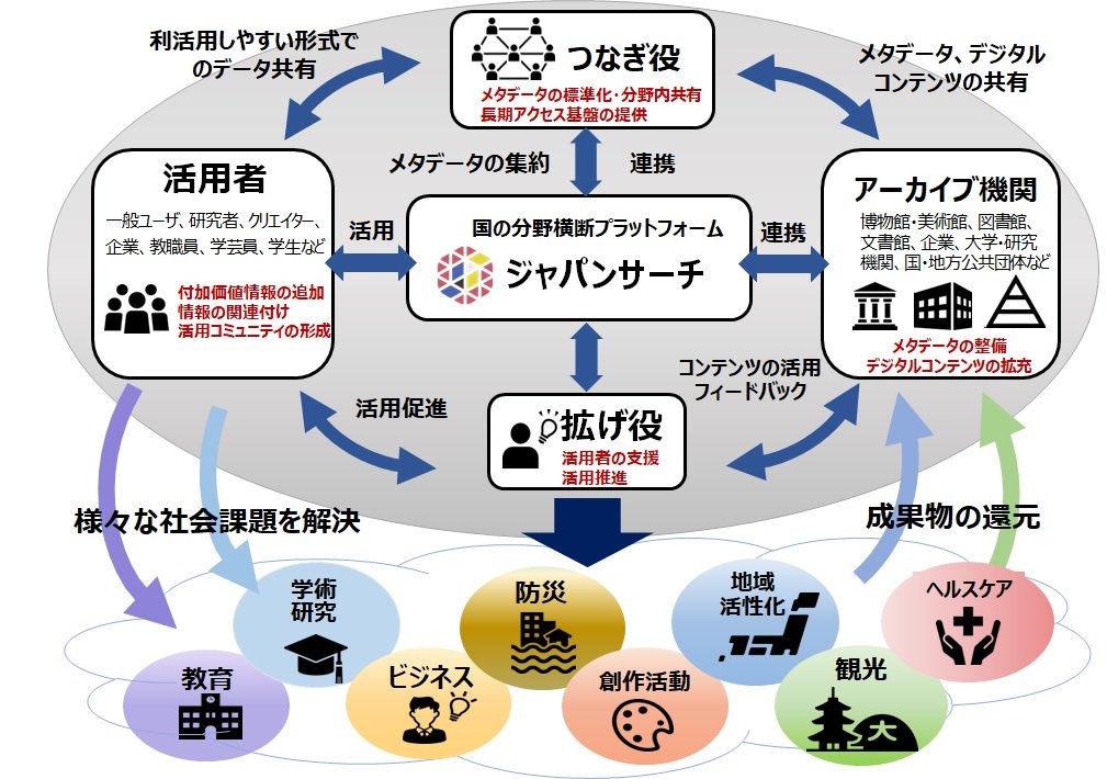 - ジャパンサーチ戦略方針2021-2025「デジタルアーカイブを日常にする」をキャッチフレーズとした、2025年までのジャパンサーチの戦略方針
