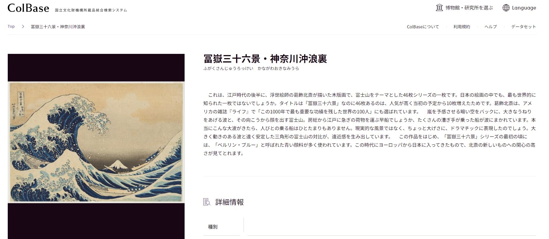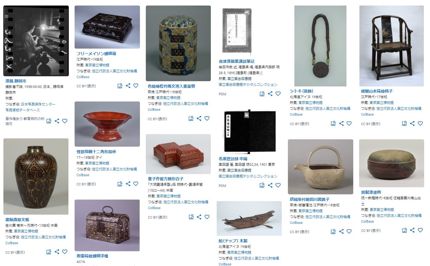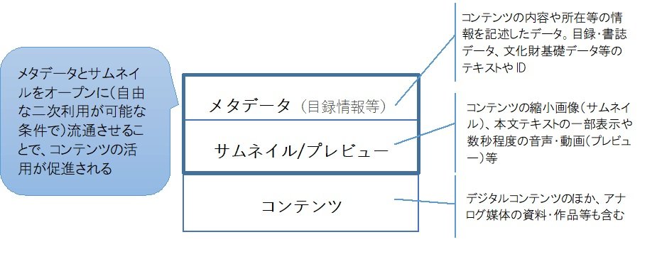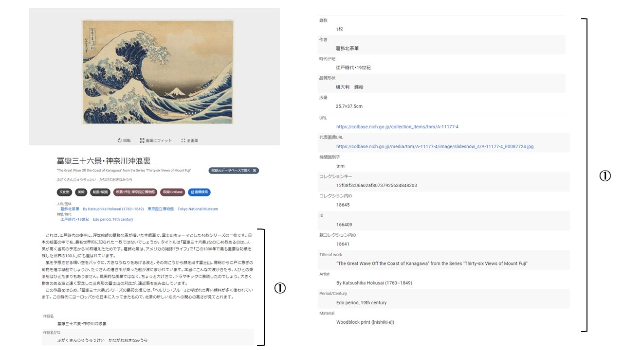 ジャパンサーチの連携コンテンツを例に説明すると、図2の①の部分がメタデータに当たります。メタデータの項目はアーカイブ機関によって異なりますが、コンテンツの作品名、作者、制作年、形質、サイズ、解説等が含まれます。サムネイルは、検索結果等で表示されるコンテンツの縮小画像です(図3参照)。