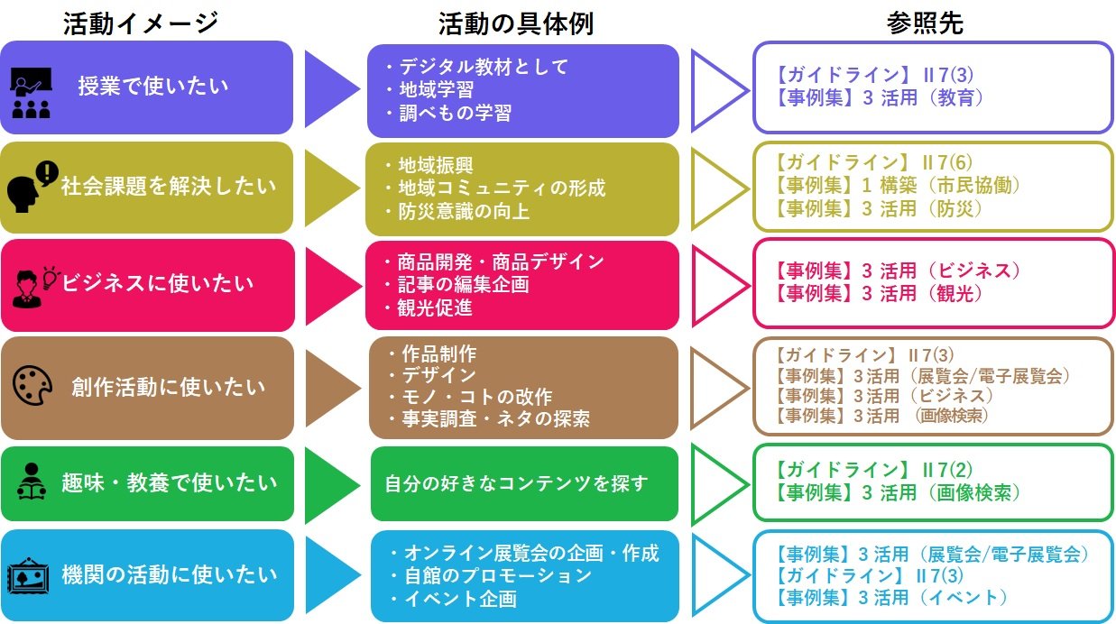 次項では、デジタルアーカイブの「活用」の具体的イメージをつかむため、活動主体ごとの取組例をみていきましょう。