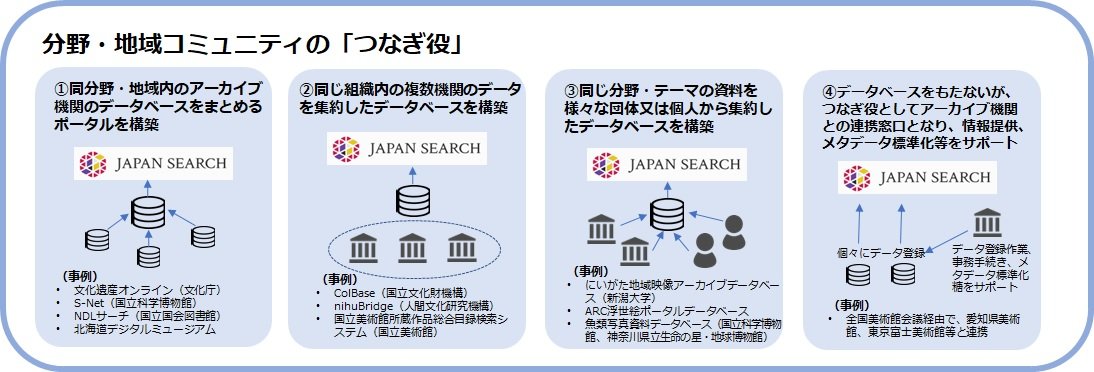 分野・地域のコミュニティのつなぎ役は、活用を進めるための新たなコミュニティ形成にも寄与することが期待されます。デジタルアーカイブは構築して終わりではなく、活用を促す取組は継続して行われる必要があるため、個々のアーカイブ機関の努力も必要ですが、つなぎ役がデータをつなぐことに加えて、人と人のつながりを生み出すことも求められます。