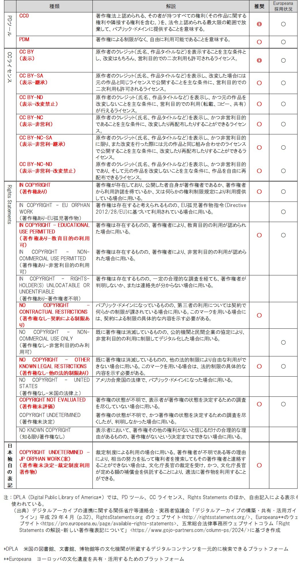 著作権の保護対象であるデジタルアーカイブのデータ活用に当たっては、適用されているライセンスや利用条件をよく確認し、順守しなければなりません。主要なライセンスについては、表4「二次利用条件表示一覧」を参照してください。