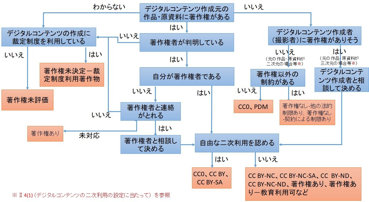 - デジタルアーカイブにおける望ましい二次利用条件表示の在り方について(2019年版)実務者検討委員会が作成した資料で、アーカイブ機関がコンテンツの権利表記を検討するための手引。本ガイドラインに統合。