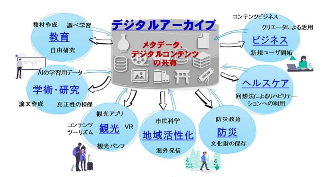 また、最近ではAI領域、とりわけ生成AIにおいて、日本語コンテンツ等のデジタルアーカイブ化が重要との指摘があり、良質で管理された学習用データセットとしてのデジタルアーカイブの価値は、今後ますます高まることが想定されます[1]。他方、AI技術の活用においては、メタデータ作成の自動化など、デジタルアーカイブに係る業務を補助するツールとしての開発も期待されます。デジタルアーカイブが活用される領域は今後も拡がりを見せるでしょう。