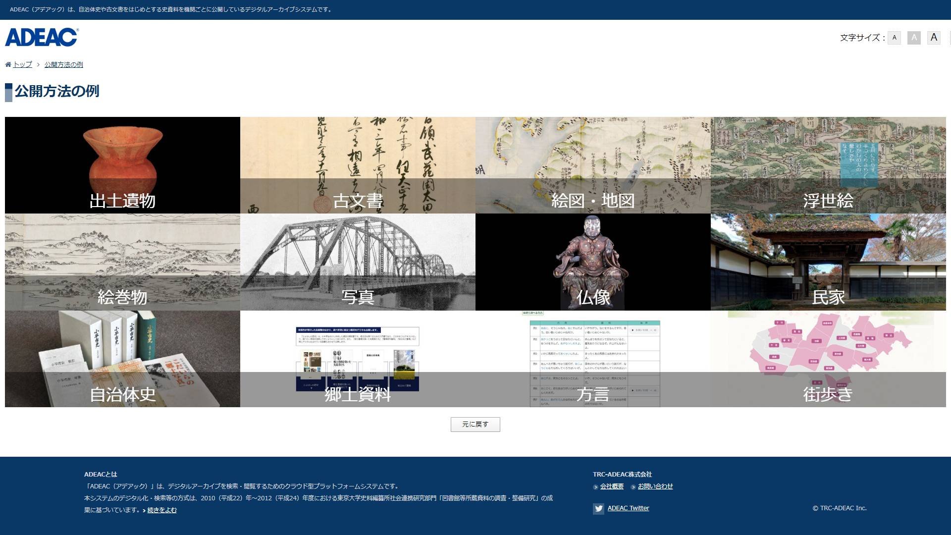 TRC-ADEAC株式会社 東京都文京区Webサイトを開く外部サイトSNSでシェアノートに追加TRC-ADEAC株式会社は、デジタルアーカイブシステムADEAC® (アデアック)を制作・運営しています。自治体史や古文書をはじめとする史資料を機関ごとにデジタル化し、ADEACで公開しています。 ※ADEAC® :A System of Digitalization and Exhibition for Archive Collections の略。 最終更新日2020/08/20