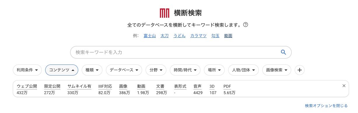 ジャパンサーチは2020年8月に正式公開された、我が国が保有する多様なコンテンツのメタデータを、統合的に(横断的に)検索することができる、分野横断型統合ポータルです。2023年2月2日現在、197の連携データベースがデータを提供しており、メタデータ件数は約2800万件になっています。書籍、美術、公文書など、15分野に分けられており、それぞれの登録状況は以下のページから確認することができます。