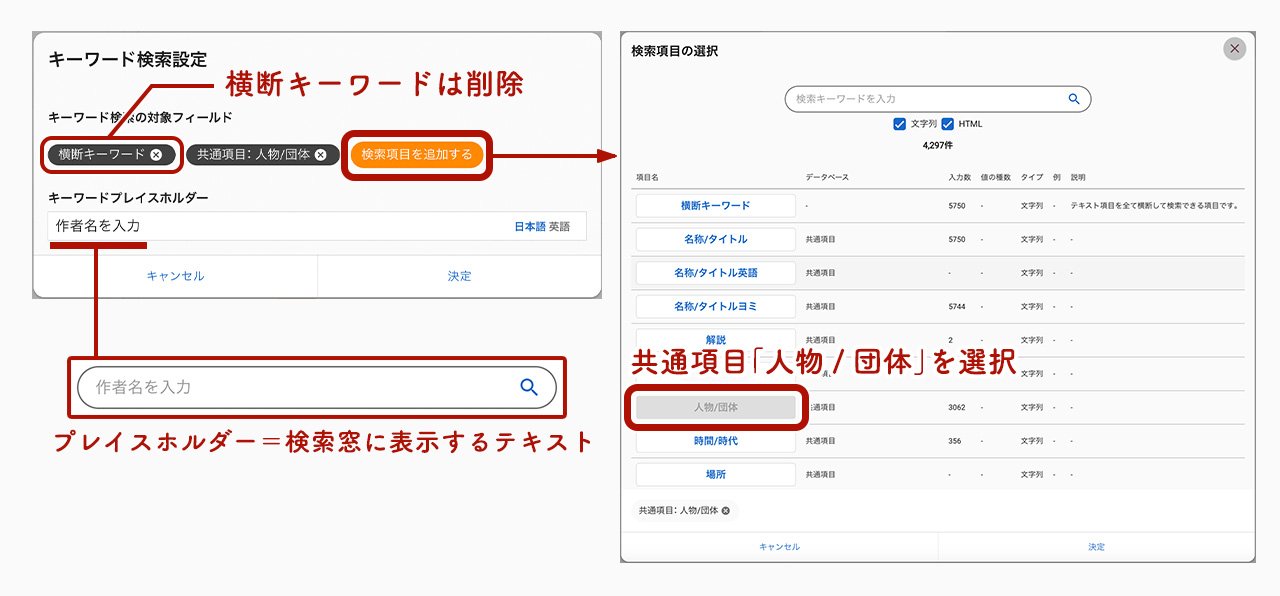 これで、作者などの人名を表すメタデータ項目のみを検索対象にしたカスタム検索ができました。