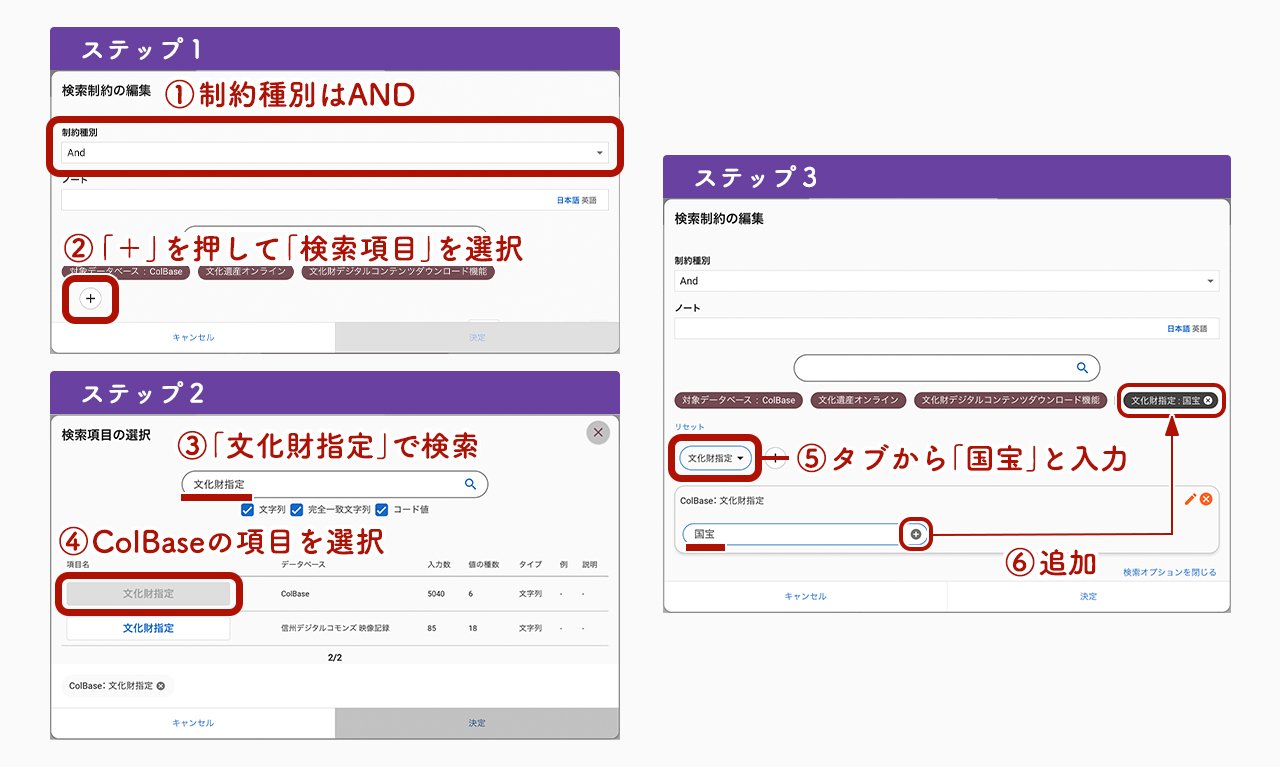 設定項目「検索プリセット」を使い、「国宝」「重要文化財」をキーワードにあらかじめ検索をかけ、上で紹介した3つのデータベースに登録されたコンテンツから「国宝」「重要文化財」に該当するコンテンツのみの集合を作ります。3つのデータベースでは文化財指定区分を含むメタデータ項目が異なるため、それぞれの項目に対して指定しましょう。ColBaseは「文化財指定」、文化遺産オンラインは「指定区分」、文化財デジタルコンテンツダウンロード機能は「カテゴリ(名称)」にその情報があります。