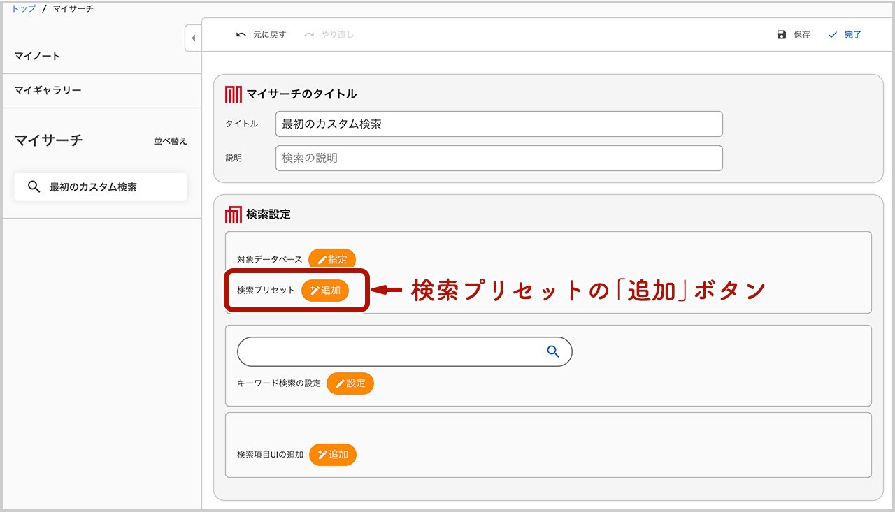 検索項目UIのタブは詳細検索と同じものから選べますが、オリジナルのタブも作ることができます。編集用ウィンドウの「カスタマイズ」で、以下の項目を設定しましょう。